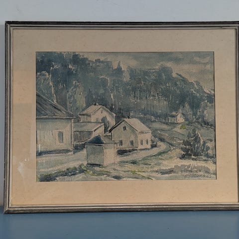 Esa Kalervo signeeraama akvarellityö vuodelta 1920. Aiheena Tampereen Juhannuskylä 112 osoitteessa sijainnut Anderssonin talo.