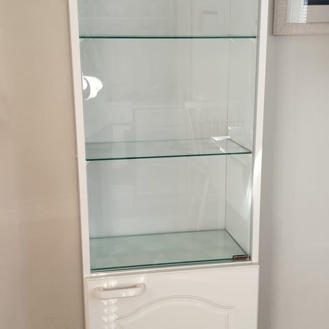 Kaunis tummanruskea lasivitriini liukuovilla, lasihyllyillä ja kahdella laatikolla.