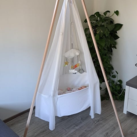 Pakettiin mukaan tulee kehdon lisäksi kuvassa näkyvä patja, katosverho, kolmijalka sekä kaksi muotoonommeltua aluslakana, jotka valmistajan omaa tuotantoa.