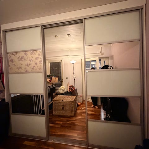 Hyväkuntoinen siisti ja tilava liukuovikaapisto 6 hyllyllä sekä vastetangolla. Tammipeilikuviointi kahdessa ovessa sekä peili yhdessä.