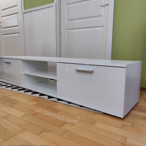 Itse maalattu vanhasta senkistä tv-taso. Vielä olisi työtä jäljellä kahvojen kanssa, mutta tosi hyvin toimii ovet ja laatikot! Tästä jollekin antiikkia! Ollaan pietetty sisätiloissa. Vain haku Toppilansaaresta. Annetaan!