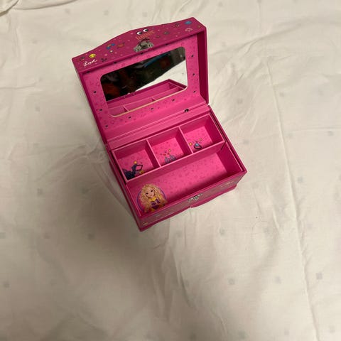 TOPModel soiva korurasia, jossa koodilukko ja äänet. Koodin voi vaihtaa (tällä hetkellä on 0000). Kun lukon avaa, laulu alkaa soimaan. Täydellinen pikku prinsessan aarteille! Paristo sisälyy. Todella hyvä kunto.