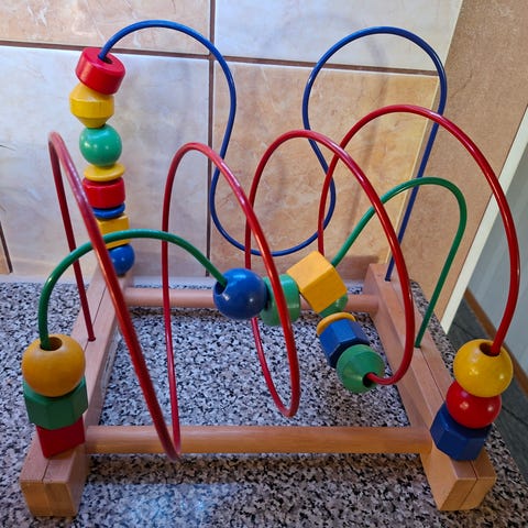 Puinen pujottelulelu. Mukana kolme eriväristä narua, joilla kuvia voi kiinnittää tauluun.