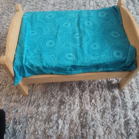 Myydään Ikean puinen nukensänky patjalla + nuken peitto ja tyynyt 2kpl (beige väriltään, jollyroomista ostettu, vähän käytetty).