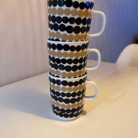 Marimekko Siirtolapuutarha mukit, 2 kappaletta. Värit musta, sininen ja valkoinen. Käytettyjä, mutta hyväkuntoisia.