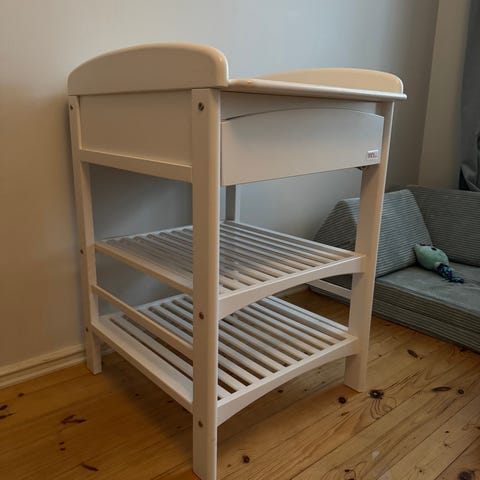 Vauvan hoitopöytä. Jaloissa on lukittavat pyörät. Hoitotason alla on vetolaatikko sekä kaksi hyllyä, johon voit kätevästi laittaa vaippoja, liinoja, ja muita tarvikkeita.