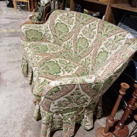 Vintage verhoiltu sohva, jossa on kukkakuvioitu kangas. Sohvassa on korkea selkänoja ja kaarevat käsinojat. Sopii olohuoneeseen tai muuhun oleskelutilaan perinteiseen sisustustyyliin.