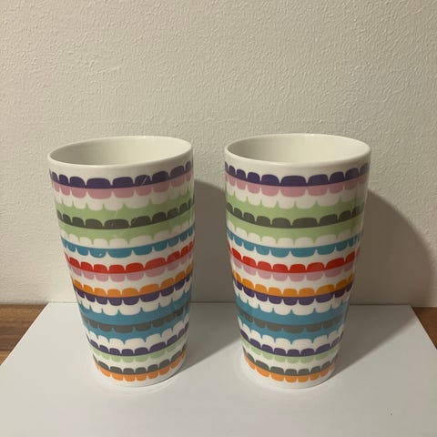 Sagaform Ässät-muki. Keraaminen, tiskikoneen kestävä. Toisenpuolen logossa pieni nirhauma sekä pientä lusikan jälkeä sisällä