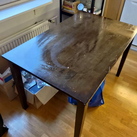 Annetaan pöytä muuton alta. Jo elämää nähnyt, mutta ehjä ja toimiva. Kerrostalossa, 2 kantajaa tarvitaan. Ei mahdu hissiin.