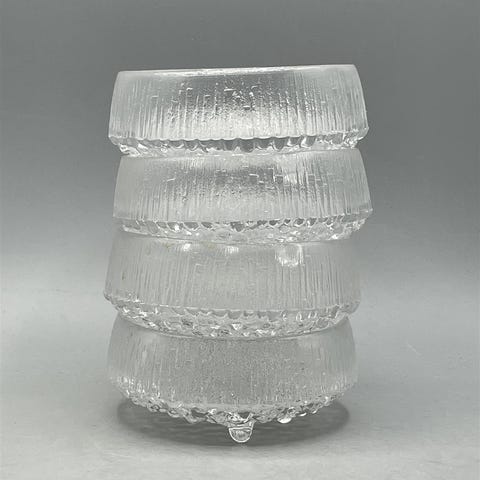 Designed by Finnish designer Tapio Wirkkala, the Ultima Thule series is inspired by the icy landscapes of Lapland and Finnish nature. The bowl’s textured glass resembles frozen patterns, and its signature rounded base rests on three elegant “ice stick” legs.