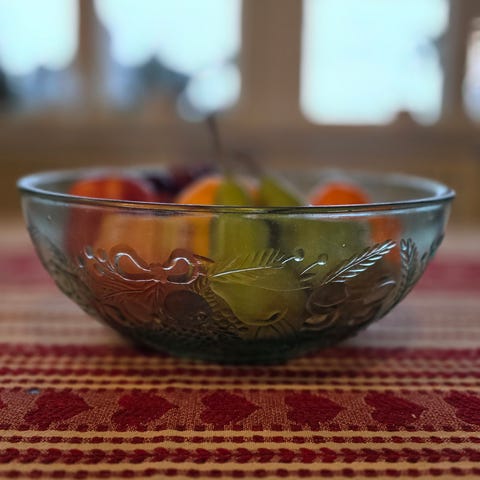 Lasinen kulho, jossa on koristeellinen hedelmä- ja kasvikuviointi. Läpinäkyvä ja himmeä pinta. Soveltuu esimerkiksi hedelmien tai muiden ruokien tarjoiluun.