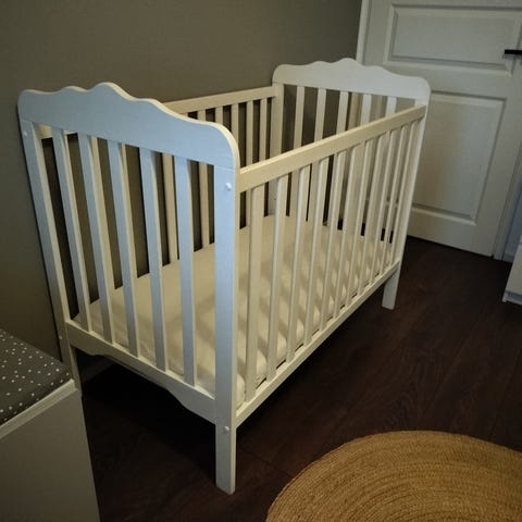 Toisella kyljellä kaksi irroitettavaa pinnaa, toisella kyljellä laskettava laita. Pohjan korkeudelle kolme eri korkeusvaihtoehtoa lapsen kasvun mukaan. Päädyssä kirahvin kuva.
