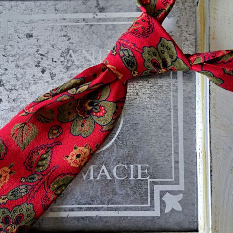 Myydään Michelsons silkkisolmio. Klassinen paisley-kuvio punaisen, tummansinisen ja beigen sävyissä. Valmistettu Englannissa.