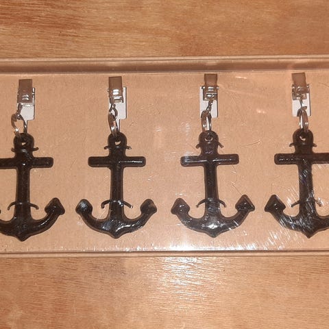 Metallinen valkoiseksi maalattu ankkuri narussa. Toisessa kuvassa sakset antamassa osviittaa koosta.