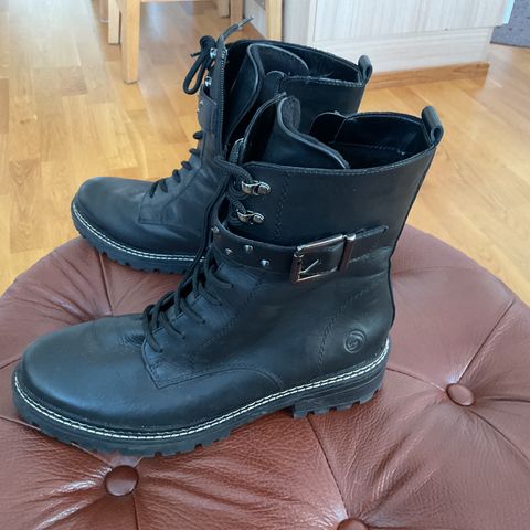 Mustat, nahkaiset maihinnousukengät, koko 40. Muutamia kertoja käytetty ja pieneksi todettu. Merkki Black Premium by EMP.