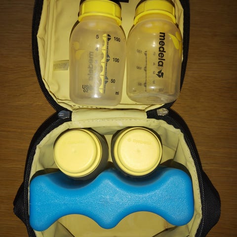 Medela äidinmaitopullot ja kylmälaukku kylmäkallella
