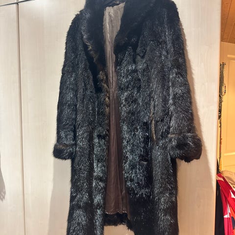 Minkki-turkki piilokoukku kiinnitys tummanruskea. Olka-hiha 60cm olka-helma 113 cm. Kaulus ja hihansuut uusittu kulumaa taskuissa ja edessä, muuten siisti ja hajuton säilytetty hyvin sisätiloissa