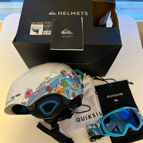 Myydään pieneksi jäänyt Quicksilver ihastuttava, laadukas, lämmin ja vuoritettu laskettelukypärä ja -lasit setti, kypärä kokoa M /56cm.