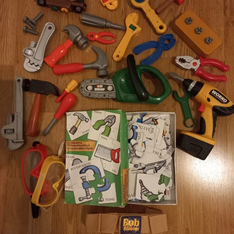 Myydään puinen lasten leluruuvipenkki, työkalut ja rakennuselementtejä.