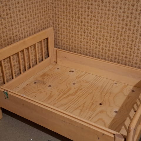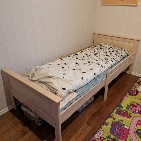 Sänkyyn sopii 75cm leveä patja. Ulkomitat: leveys 87,5cm, korkeus 68cm, pituus min. 108.