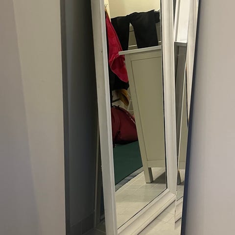 Suorakaiteen muotoinen peili ja taustalevy, tarkat mitat 1195 x 305 mm. Alunperin peilissä oli puiset kehykset jotka menivät rikki. Peili itse on täysin ehjä.
