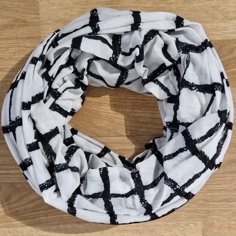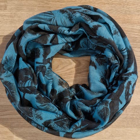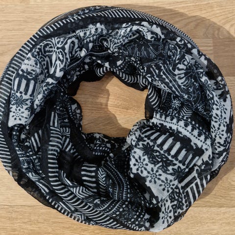 Kuviollinen tuubihuivi on uusi eli täysin käyttämätön. Huivissa on yhä laput kiinni. Materiaali on 100 % polyesteria.