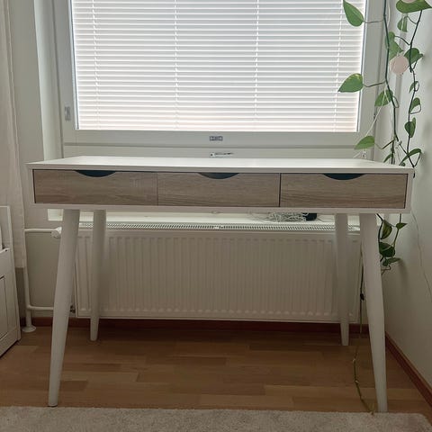 Myynnissä kuvan pöytä. Pöytä on hyvässä kunnossa ja siihen mahtuu paljon tavaraa. Korkeutta voi vaihdella ymmärrykseni mukaan 65-125 cm välillä. Syvyys on kulmassa 110 cm ja toisessa päässä 60 cm. Kulma vasemmalla puolella.
