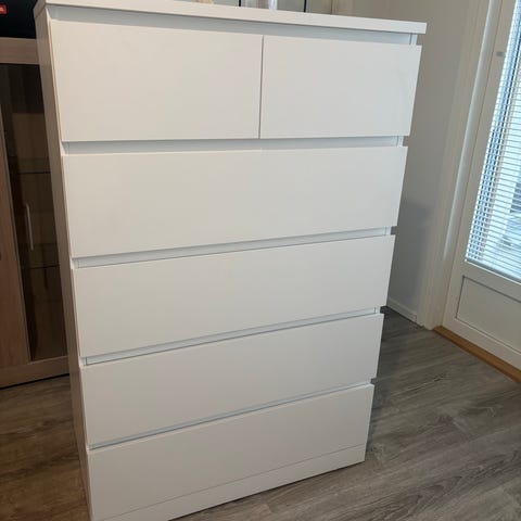 Malm lipasto neljällä laatikolla ja lasi levyllä