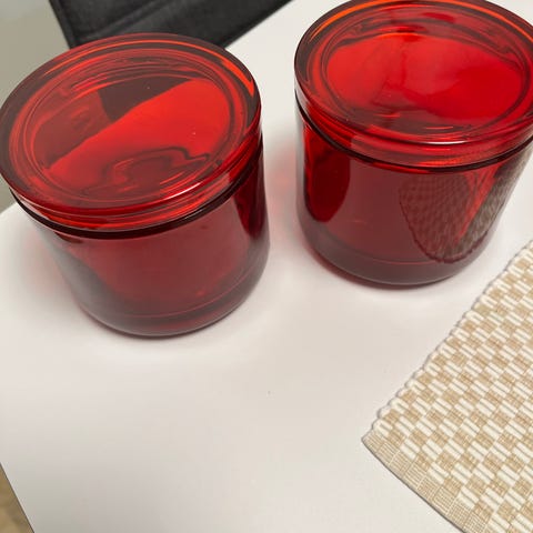 90- luvulta lasipurkki, jossa valkoinen kansi ja hanhikuviot. Ei ole Ikea eikä Ellos . Sovelluksen takia valittava joku.