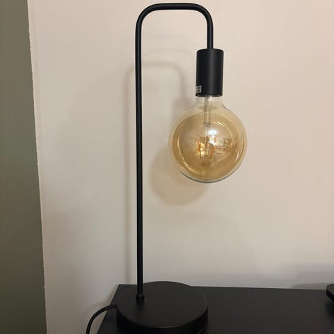 Musta karheapintainen metallinen pöytävalaisin pitkällä liikutettavalla jalalla. Palvellut meillä lukulamppuna sohvan päädyssä. Jalustan leveys 18 cm, valaisimen korkeus n. 56 cm, kuvun pituus 20 cm.