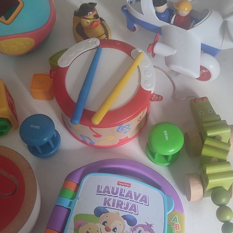 Vauvan lelusetti, sisältää erilaisia pehmoleluja, kaksi pehmokirjaa ja muita pieniä leluja. Mukana on punainen Brio helistin, pehmeitä eläinhahmoja, turvalonkeroita ja värikäs lelu vaunuihin. Lelut on suunniteltu lasten käyttöön ja ne tarjoavat monipuolista leikki- ja oppimismateriaalia.