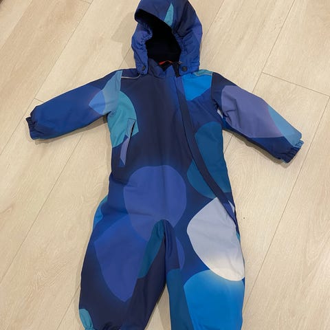 Reiman toppahaalari koossa 80cm. Väri tummansininen. Hieman pehmentymää polvissa ja pepussa, mutta ei näy mitenkään. Mielestäni erittäin hyvässä kunnossa ja siisti puku seuraavalle.