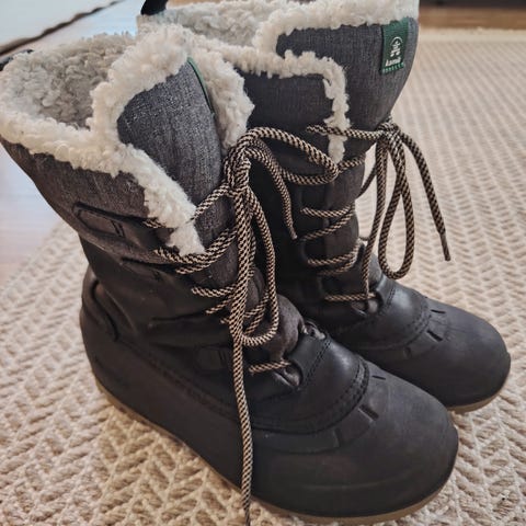 Koville (-30 celsius asteen) pakkasille suunnitellut pitkävartiset kengät ovat lämpimät ja vedenkestävät. Paksu EVA-pohjallinen. Solmittavat nauhat. Varren pituus kannan pohjasta mitattuna on noin25cm. Irrotettavan pohjallisen on 26,3cm eli koko 40 olisi sopiva noin 25-25,5cm pituiseen jalkaterään. Ulkopohjalliset siistit. Keinovuori siisti myös. Varren materiasli ulkopuolelta siisti. Kenkien kärjet kuluneet nuorella käytössä eli niiden siistiminen/ korjauttaminen jää ostajalle. Samoin alin materiaali kengissä paikoin nyppyyntynyt. Katsothan lähikuvat tarkasti. Sopii lapsille tai aikuisille. Väri on musta.