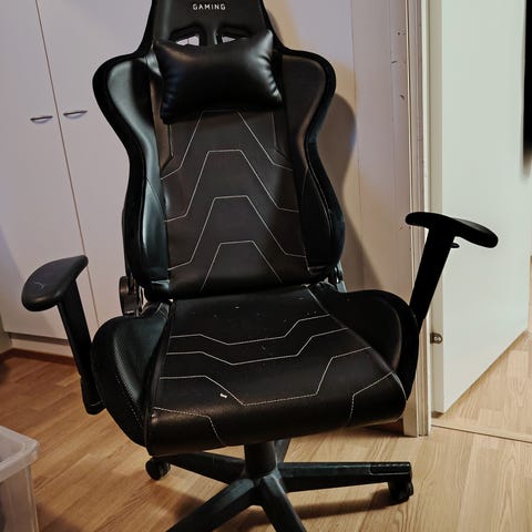 Musta keinonahkainen HyperX Blast pelituoli. Vaatii kaasujousen ja selkänojan korjausta. Joutaa kierrätykseen, ellei jollekin kelpaa. Kaasujousi vuotaa silloin tällöin ja selkänojan lukitus präkää. Käsinojat kuluneet.