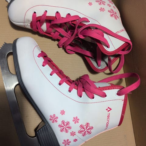 Tecnopro lasten hyväkuntoiset kaunoluistimet, koko 34. Sisämitta 21,5cm. Luistimet valkoiset pinkeillä nauhoilla.