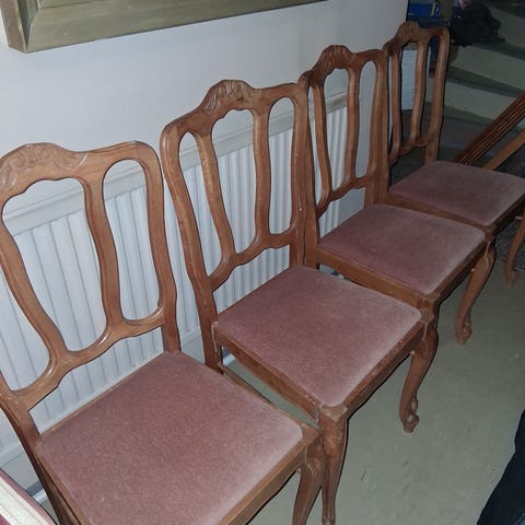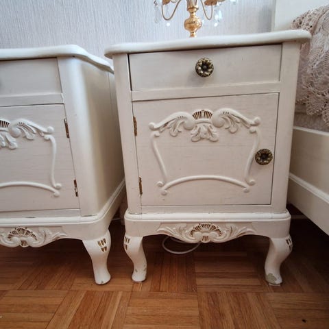 Ruokaryhmä=pöytä+tuolit, keinutuoli, sänky, yöpöydät, verholauta, hopekaappi.