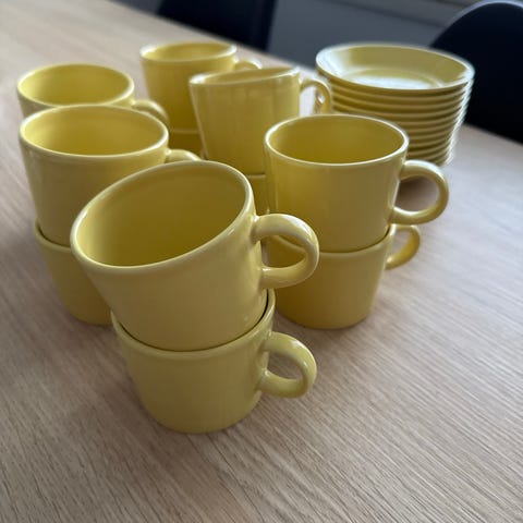 Arabia Teema astiasto, joka sisältää 4 pientä lautasta ; 14cm halkaisija, 4 isoa lautasta; halkaisija 21 cm, neljä syvää lautasta halkaisija 15 cm, neljä kahvimukia ja neljä mukia. Nouto Kirkkonummelta Ravalsista tai arkisin Ruoholahdesta