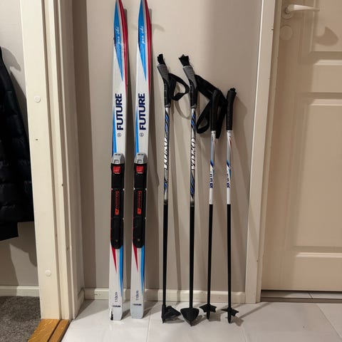 Käytetyt, mutta vielä toimivat sukset ja sauvat.