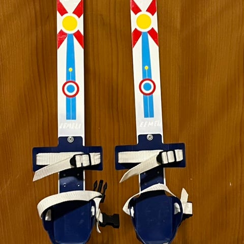 Myydään kenkiin kiinnitettävät 120 cm pitkät sukset ja 85 cm sauvat