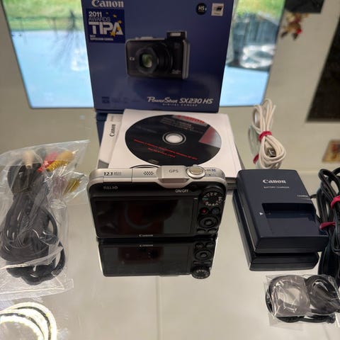 Mukaan manuaalivihko, kamerapussi, alkuperäinen pakkaus ja ohje-cd-levy.