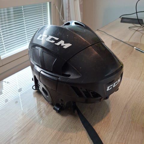 Valkoinen CCM FL40 XS jääkiekkokypärä harmaalla ristikolla. Hyväkuntoinen ja ehjä sekä ulkokuoren että pehmusteiden osalta.