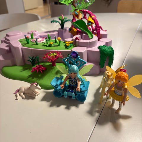 Yhdistelmä Playmobil pakkauksia. Fairy castle, hevoskärryt, puu ja keinu. Joitain osia puuttuu mutta toimii hyvin leikeissä siitä huolimatta.