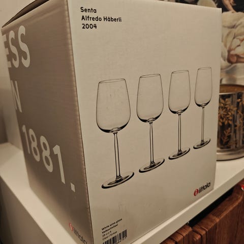 Iittala Senta valkoviinilasit 2 kpl. Käyttämättömät. Säilytetty omassa pakkauksessaan. Pakkauksessa kulumaa/tahraa säilytyksen jäljiltä.