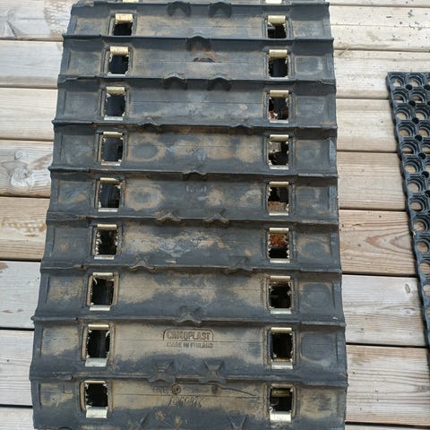 Rungoltaan ehjä matto, ei ole revennyt mistään. Lappuja puuttuu jonkunverran ja tosiaan aika kulunut matto kyseessä. Viime talvena on vielä ajettu tuolla. Siitä esim kärrynpohjaan tai varamatoksi tms