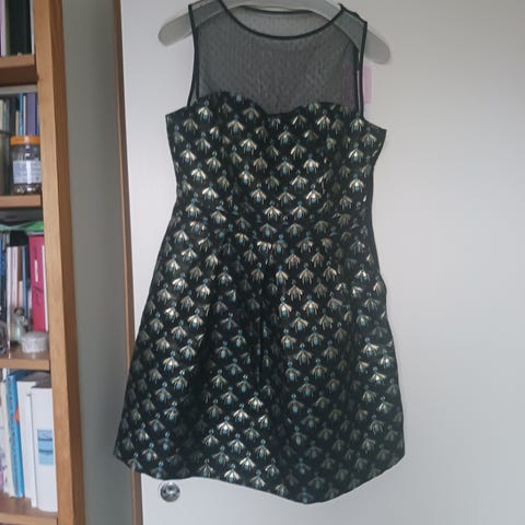 Musta juhla- tai cocktailmekko, koko M- L.Mekossa on musta pääväri ja oranssi satiinivuori, joka näkyy helman sisäpuolella. Sopii juhla- ja cocktailtilaisuuksiin. Teetätetty ompelijalla. Mitat: kainalo-etureuna 106 cm, vyötärön ympärysmitta rinnan alta 85 cm, mekko rinnan alueelta kokoa B, mekon takareuna 37 cm etureunaa pidempi. Materiaali keinonahkaa.