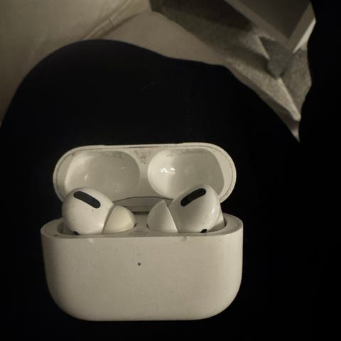 Apple AirPods Pro langattomat kuulokkeet valkoisena. Mukana latauskotelo. Korvakappaleissa aktiivinen melunvaimennus ja vaihdettavat silikoniset korvatyynyt. Akku kestää ja podit muutenkin toimii normaalisti.