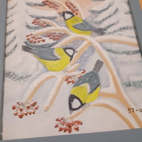 Iloiset linnut liverryksineen on maalattu akryyli väreillä.