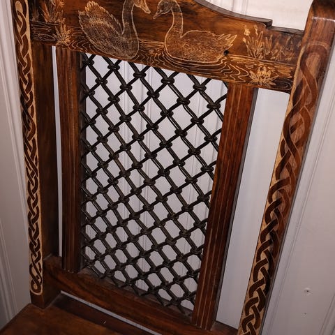 Kaiverrettu ja muotoiltu viikinkihahmoilla ja joutsenella, joka on rakkauden symboli Suomessa. 99 korkeus, 45 syvyys, 40 leveys