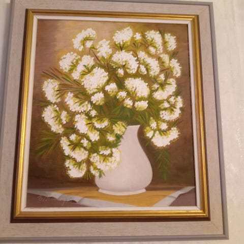 Taulu, jossa valkoiset kukat maljakossa. Maalaus on kehystetty ja signeerattu, Mollberg 95.