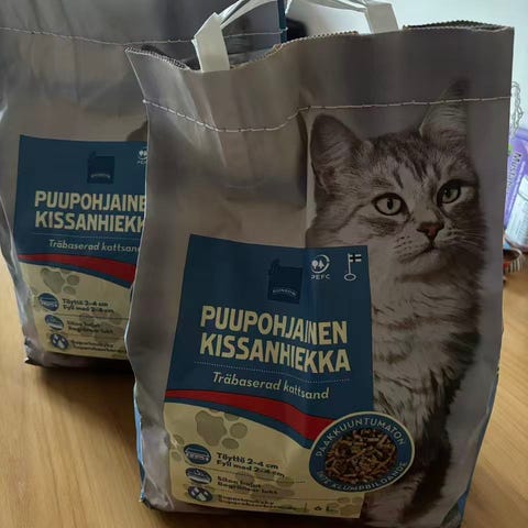 Yksi avaamaton ja yksi avattu n. puolilleen tai 2/3 käytetty kissanhiekka.